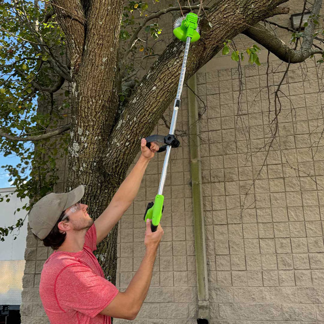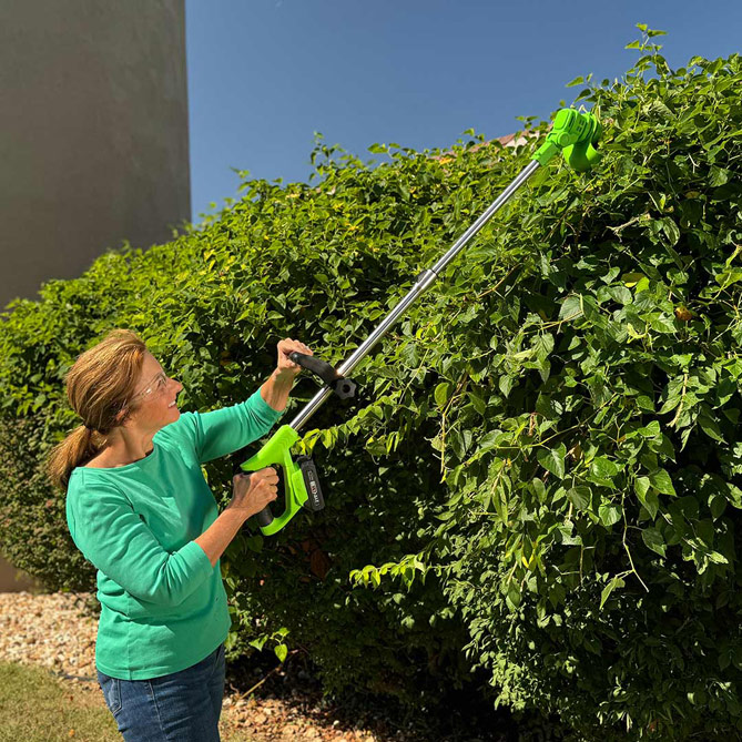 Odkryj również jego moc jako przycinarki, ścinając, usuwając i oczyszczając wybrany obszar. Wysuwający się teleskopowy uchwyt, zamienisz w super piłę, która sięgnie martwych gałęzi i zetnie je bez konieczności użycia drabiny. To niesamowite, ile można zrobić za pomocą Rotorazer 8 w 1, prawda?