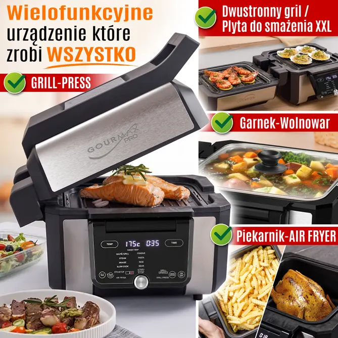 Masz dość gromadzenia urządzeń kuchennych, które służą tylko do jednej rzeczy, a potem trzeba je zmywać? Wybierz GOURMAX PRO! To jedyne urządzenie, które nadaje się do wszystkiego, ponieważ piecze, gotuje, dusi, smaży, zapieka, suszy, gotuje na parze, smaży bez oleju...