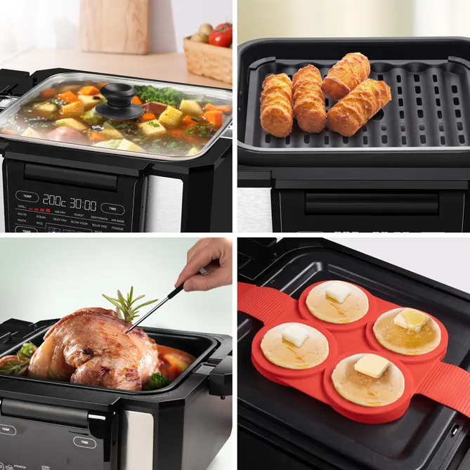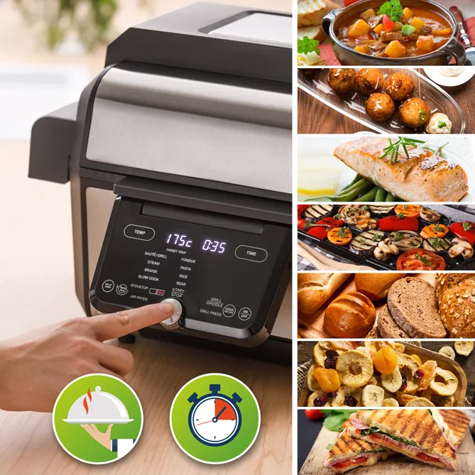 Masz dość gromadzenia urządzeń kuchennych, które służą tylko do jednej rzeczy, a potem trzeba je zmywać? Wybierz GOURMAX PRO! To jedyne urządzenie, które nadaje się do wszystkiego, ponieważ piecze, gotuje, dusi, smaży, zapieka, suszy, gotuje na parze, smaży bez oleju... Wystarczy nacisnąć przycisk, a będziesz mieć do dyspozycji płytę grzejną, grill, garnek o dużej pojemności, frytkownicę powietrzną, piekarnik, opiekacz do kanapek... Wszystko czego chcesz, do tego bez dymu i brudu, prawie bez oleju. Oszczędzasz prąd, czas i miejsce.